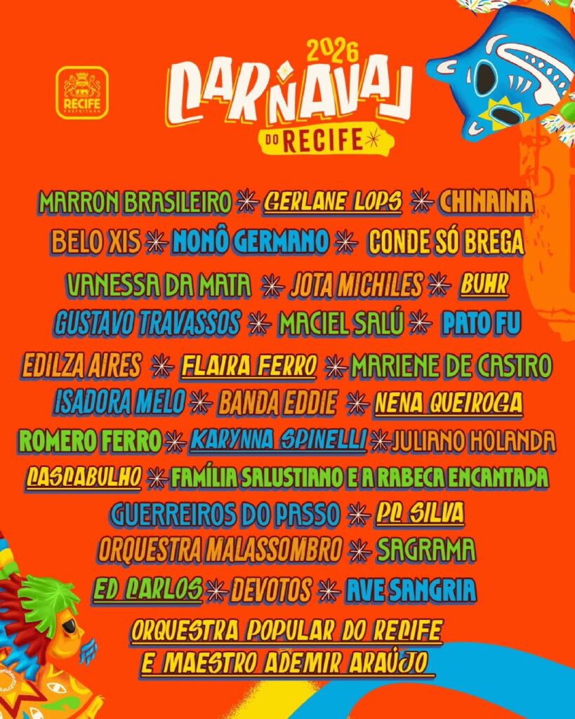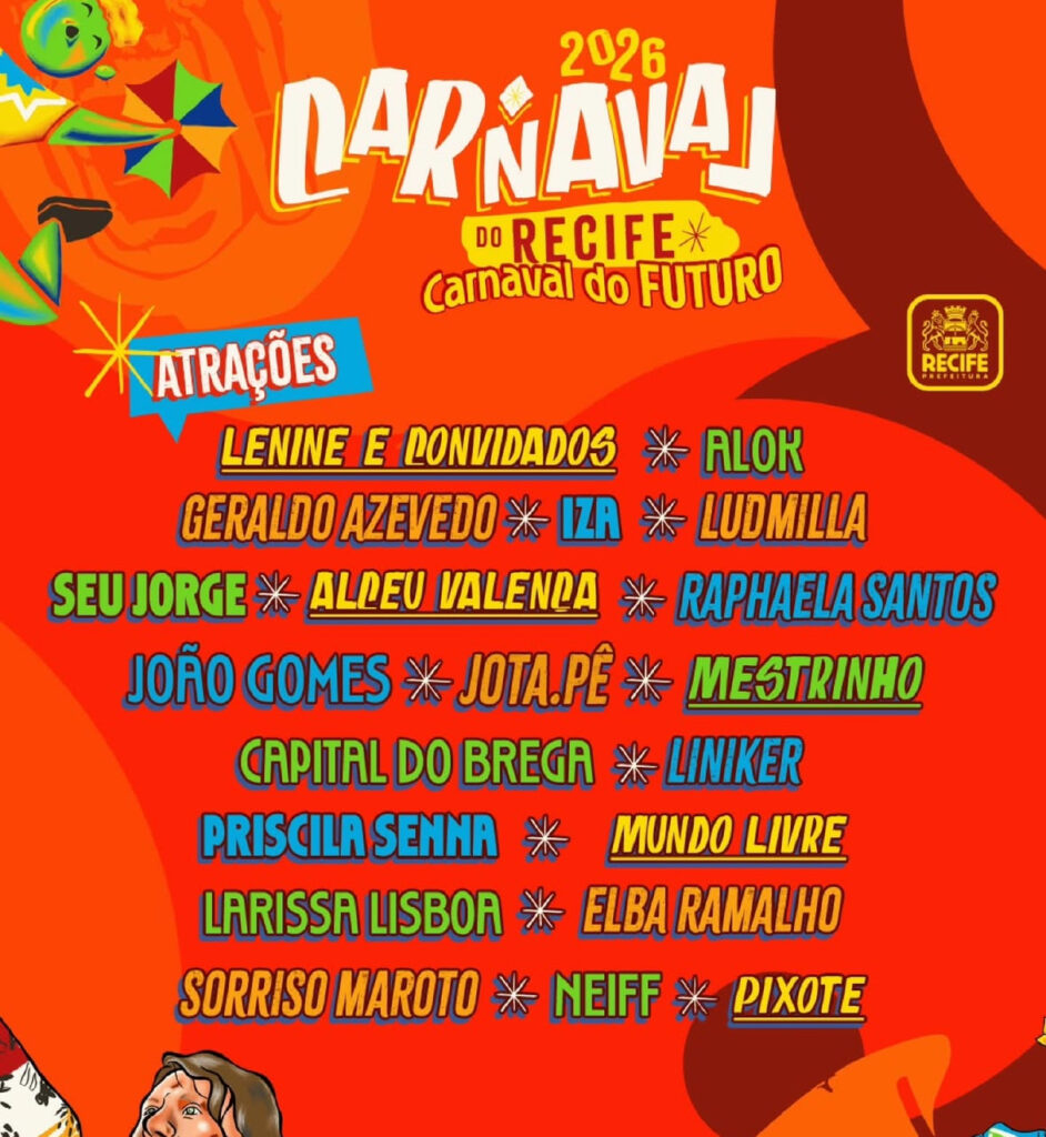 A lista de confirmados também inclui Jota.Pê, Mestrinho, Priscila Senna, Raphaela Santos, Elba Ramalho, Alok, Iza e Os Neiffs, ampliando o leque de ritmos e reafirmando o compromisso do Recife com a diversidade cultural e musical durante o período carnavalesco.
